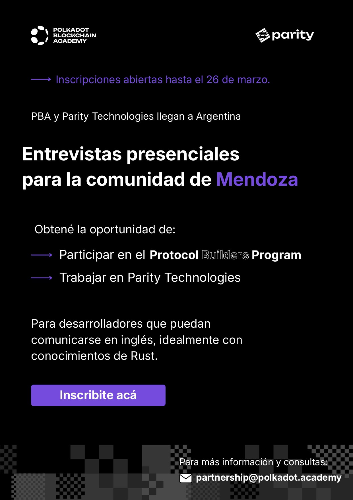 INSCRIBIPCIONES HASTA EL 26 DE MARZO https://airtable.com/applPmzSTEQL0b6rG/pagwyD6wc6qog9v9C/form PBA y Parity Technologies llegan a Argentina Protocol Builders Program – Mendoza Entrevistas presenciales para la comunidad de Mendoza